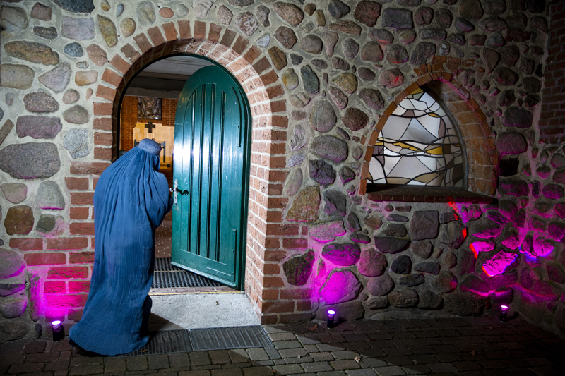 Die Ole Kerk in Bispingen (erbaut 1353), die auf diesem Bild zu sehen ist, steht stellvertretend als sichtbares Zeichen dafür, dass sich seit Jahrhunderten Christen und Christinnen aus unseren Dörfern in der Lüneburger Heide zum Gottesdienst treffen, als sichtbares Zeichen unserer kulturellen und religiösen Prägung. Seit einigen Jahren kommen Geflüchtete, und andere Neubürger, zu uns nach Bispingen, die kulturell und religiös anders geprägt sind. Kirche mit ihrer Kultur trifft auf Menschen, die ihre Kultur zu uns bringen; z.B. die orthodoxe Christin aus Eritrea oder das muslimische Ehepaar aus Afghanistan. Das Foto zeigt eine muslimische Frau, die durch die geöffnete Tür unserer Olen Kerk in Bispingen schaut – in unsere Kultur, unsere Gemeinde, die sie, so unsere Hoffnung, mit geöffneten Türen und Herzen vorfindet.