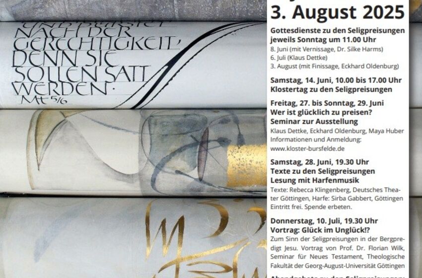 Das Geistliche Zentrum Kloster Bursfelde lädt zur Ausstellung "Seligpreisungen" in die Klosterkirche ein. Gezeigt werden 8 Schriftfahnen, auf denen Kalligraphien der Darmstädter Künstlerin Maya ...