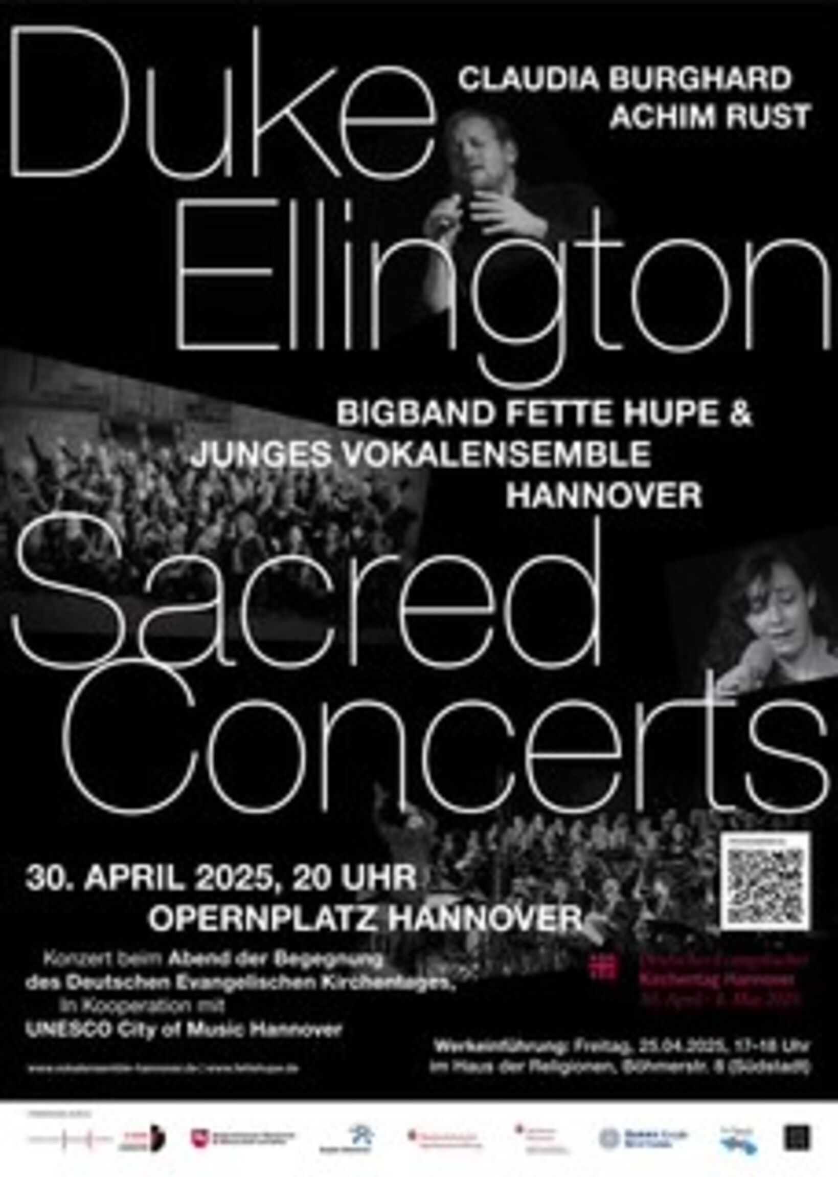 Als Eröffnungskonzert des Deutschen Evangelischen Kirchentages und in Kooperation mit der UNESCO City of Music Hannover führen das Junge Vokalensemble Hannover und die Big Band Fette Hupe zusammen mit zwei Vokalsolisten, Stepptänzer und Sprecher Duke Ellingtons „Sacred Concerts“ am 30. April 2025 um 20.00 (-21.30 Uhr) auf der Bühne des Opernplatzes Hannover auf. Ellingtons nur selten aufgeführtes Jazzoratorium ist eine einzigartige Fusion aus Jazz und europäischer Kirchenmusik. Typischer Ellington-Swing mit Big Band-Besetzung steht neben Wechseln von instrumentalen, Solo- und Chorstücken mit Vokalsolisten, Sprecher, Stepptänzer und Chor. Der Eintritt ist frei.