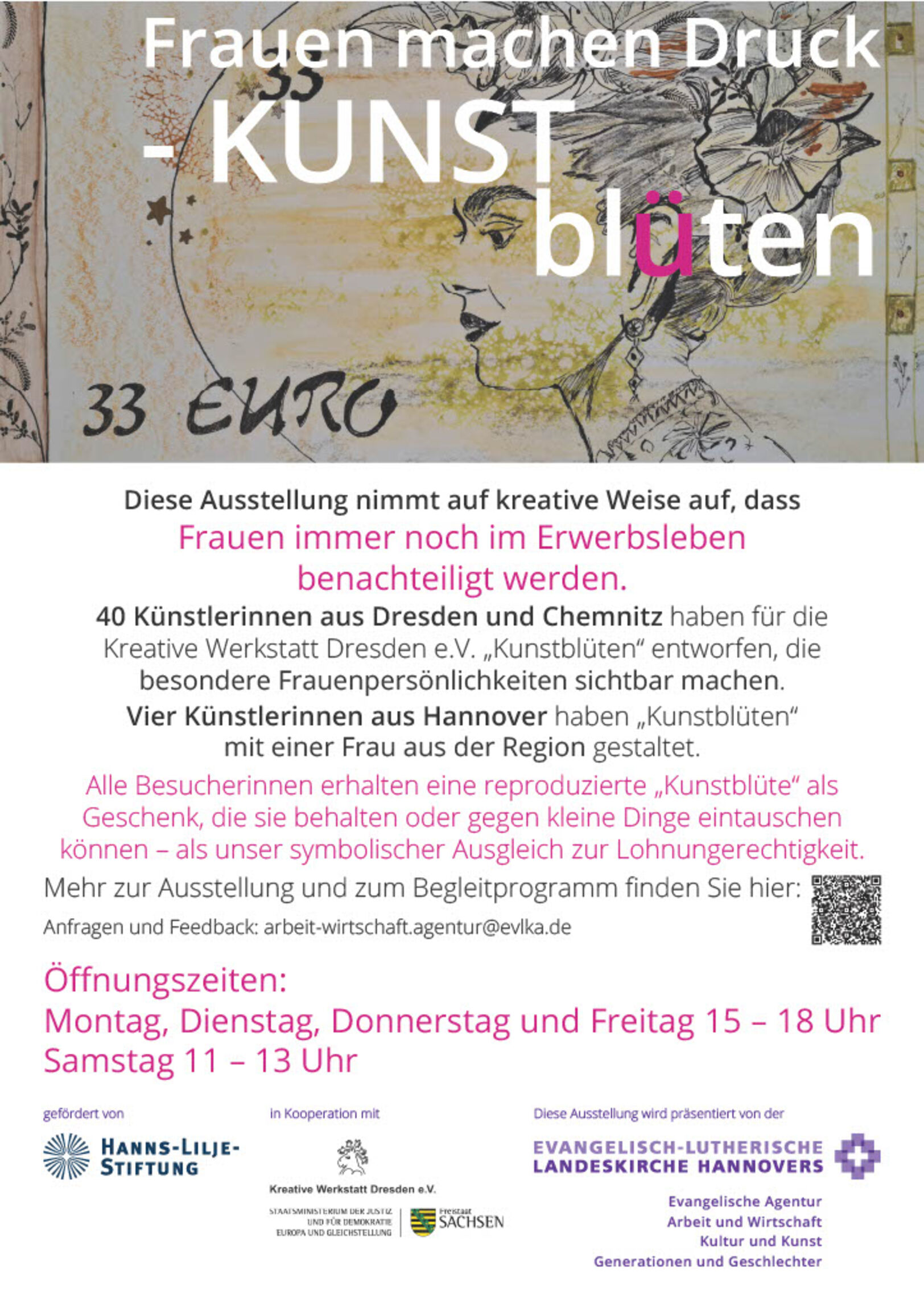 Im Jahr 2025 hat die Kreative Werkstatt Dresden e.V. im Rahmenprogramm der Europäischen Kulturhauptstadt in Chemnitz vierzig Künstlerinnen eingeladen, eine sogenannte „Geldblüte“ zu gestalten – Kunstwerke, die bekannte, aber auch vergessene oder bislang wenig beachtete Frauenpersönlichkeiten sichtbar machen. Für die Präsentation in Hannover haben wir vier Künstlerinnen aus der Region eingeladen, jeweils eine „Kunstblüte“ mit Bezug zu einer Frau aus Hannover und Umgebung zu entwickeln. In der Ausstellung sind nun alle entstandenen Arbeiten zu sehen.